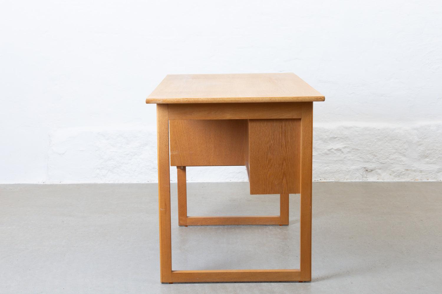 Single pedestal desk in oak with three drawers and rear bookshelf.
