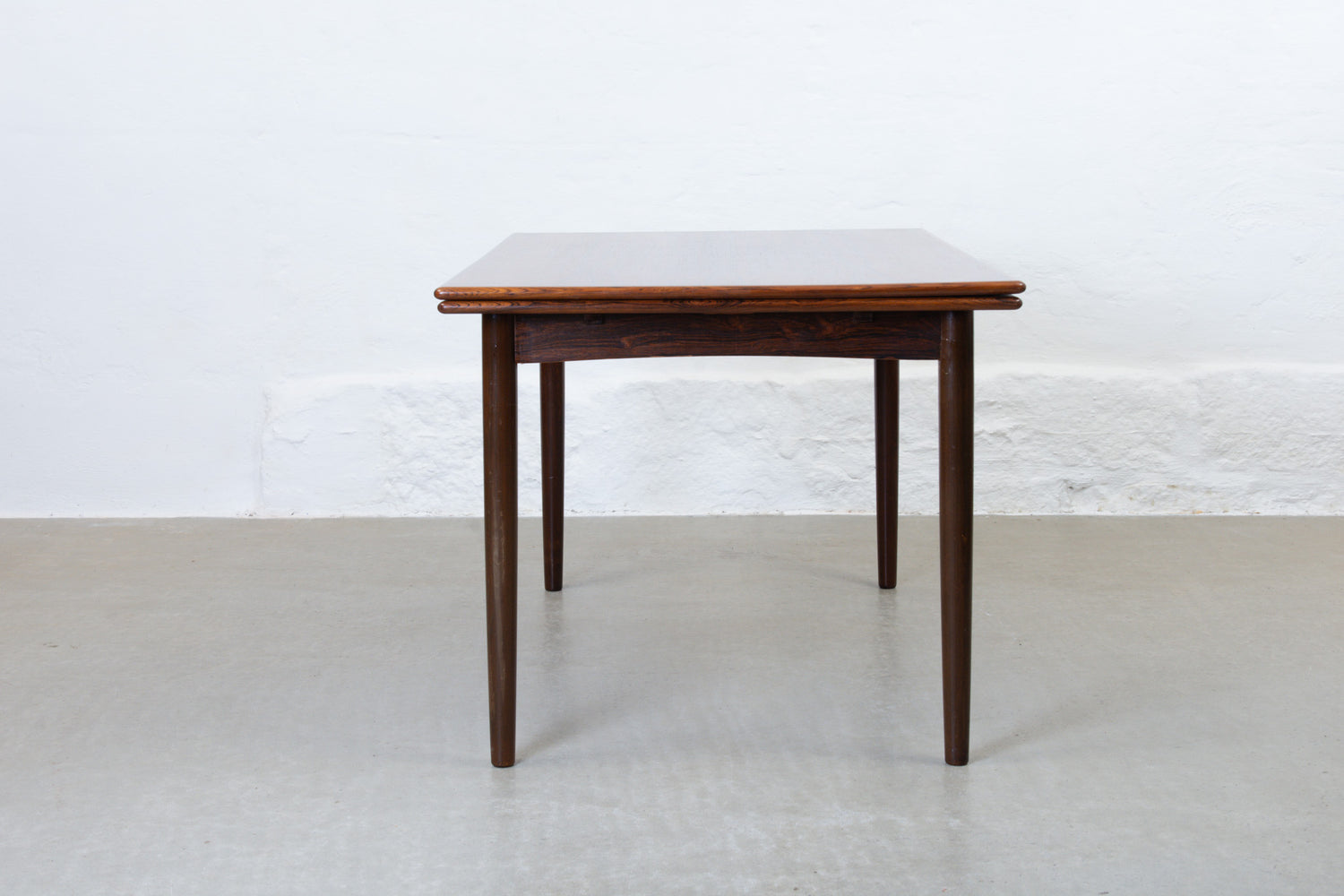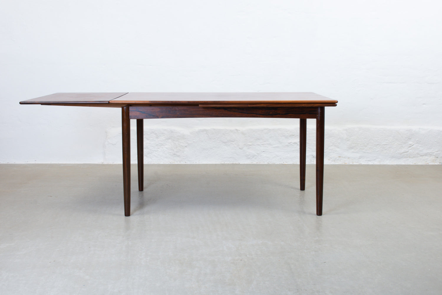 Extending dining table in rosewood with two hidden pull-out extension leaves. Sits six normally and up to ten comfortably when fully extended.