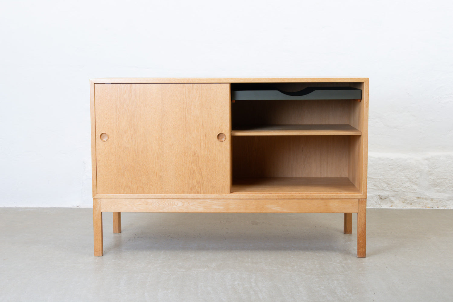 Sideboard in oak with sliding doors, one internal shelf and a cutlery/filing tray.
