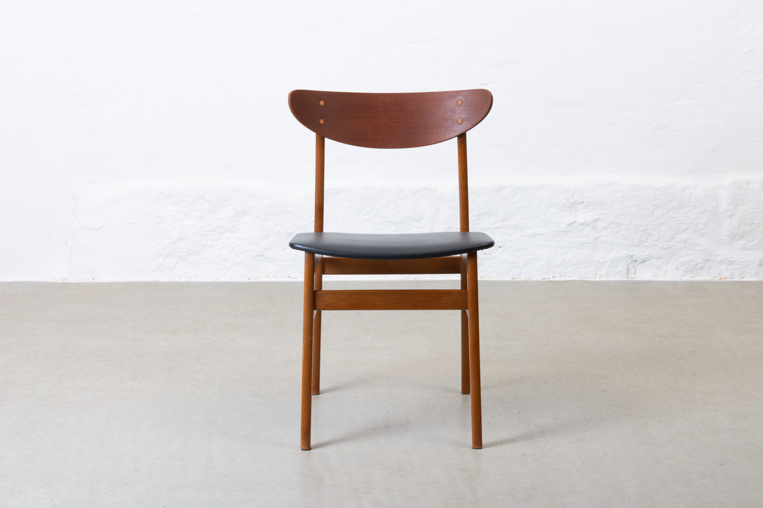 Set of four dining chairs with teak backs, beech frames and padded seats upholstered in their original vinyl fabric.