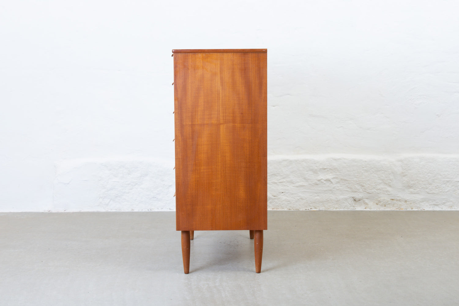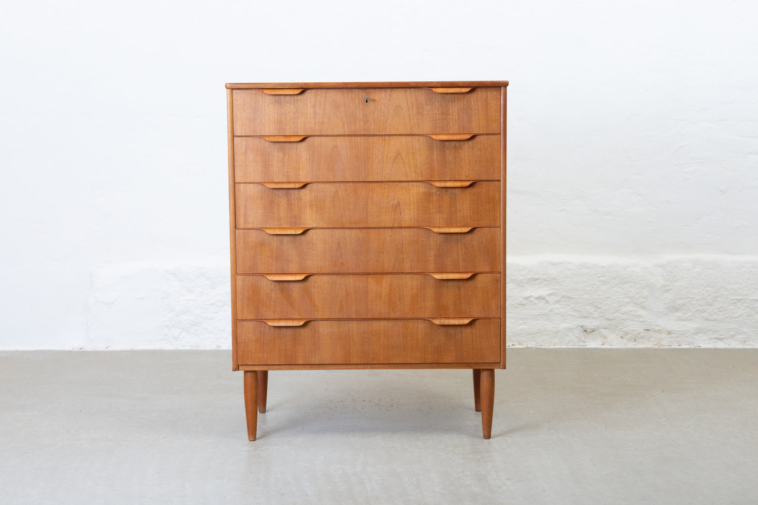Teak chest of six drawers with curved handles and locking top drawer. Sits on tapered teak legs and the original key is included.