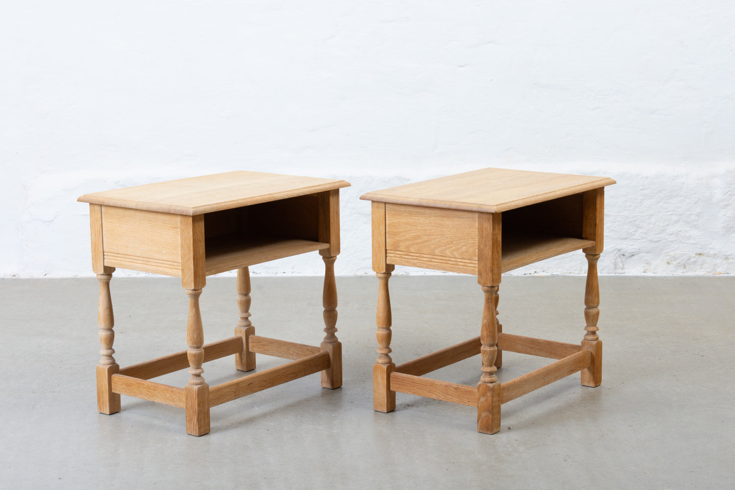 Matching pair of bedside tables in oak in the manner of Henning Kjærnulf.