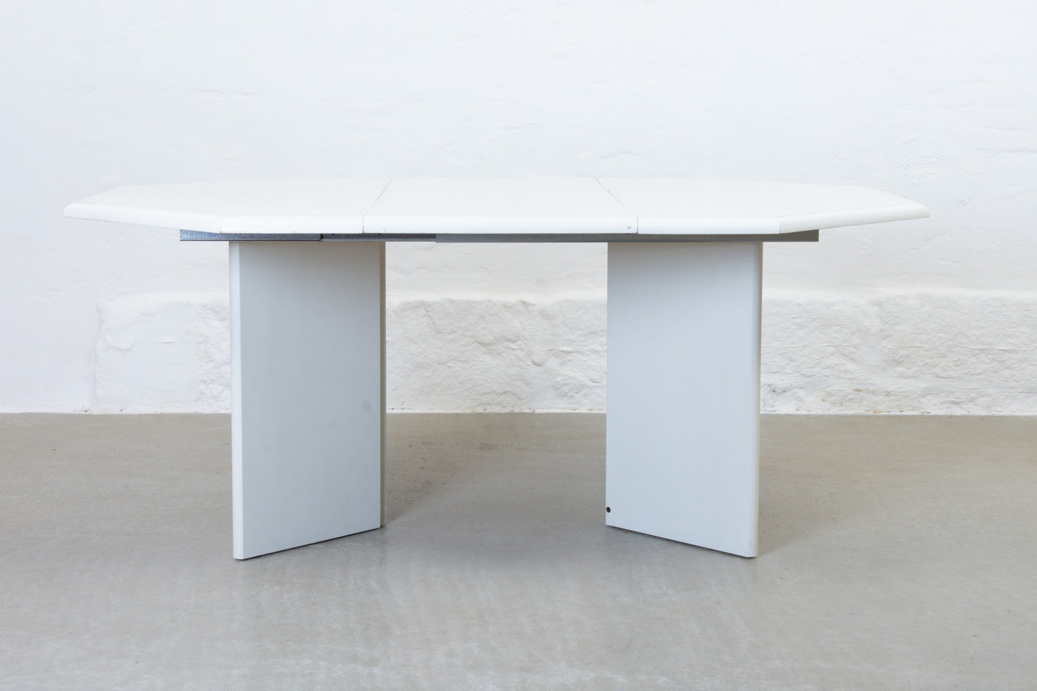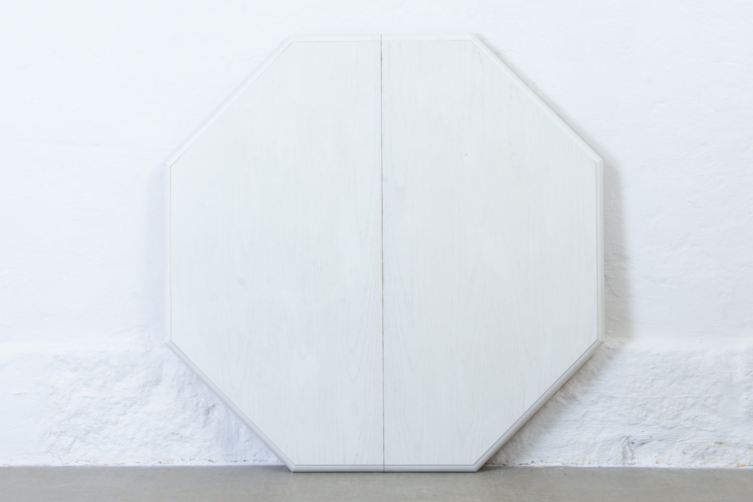 Extending hexagonal dining table on a plinth base in stained white oak. Includes two drop-in extension leaves and sits six normally or up to twelve comfortably when fully extended.