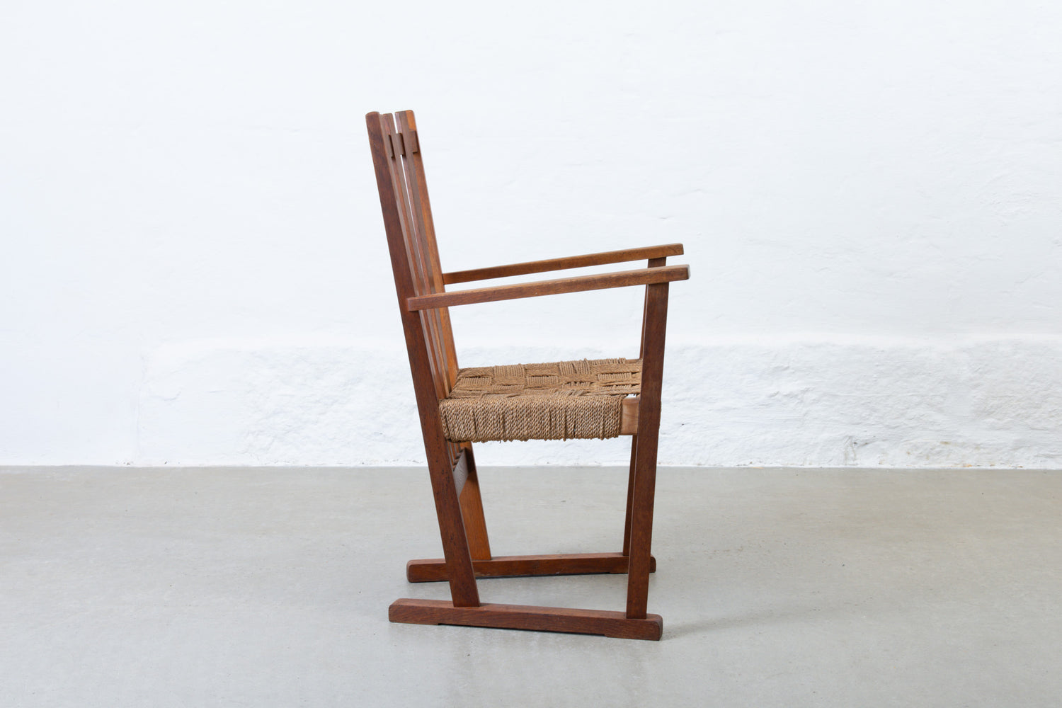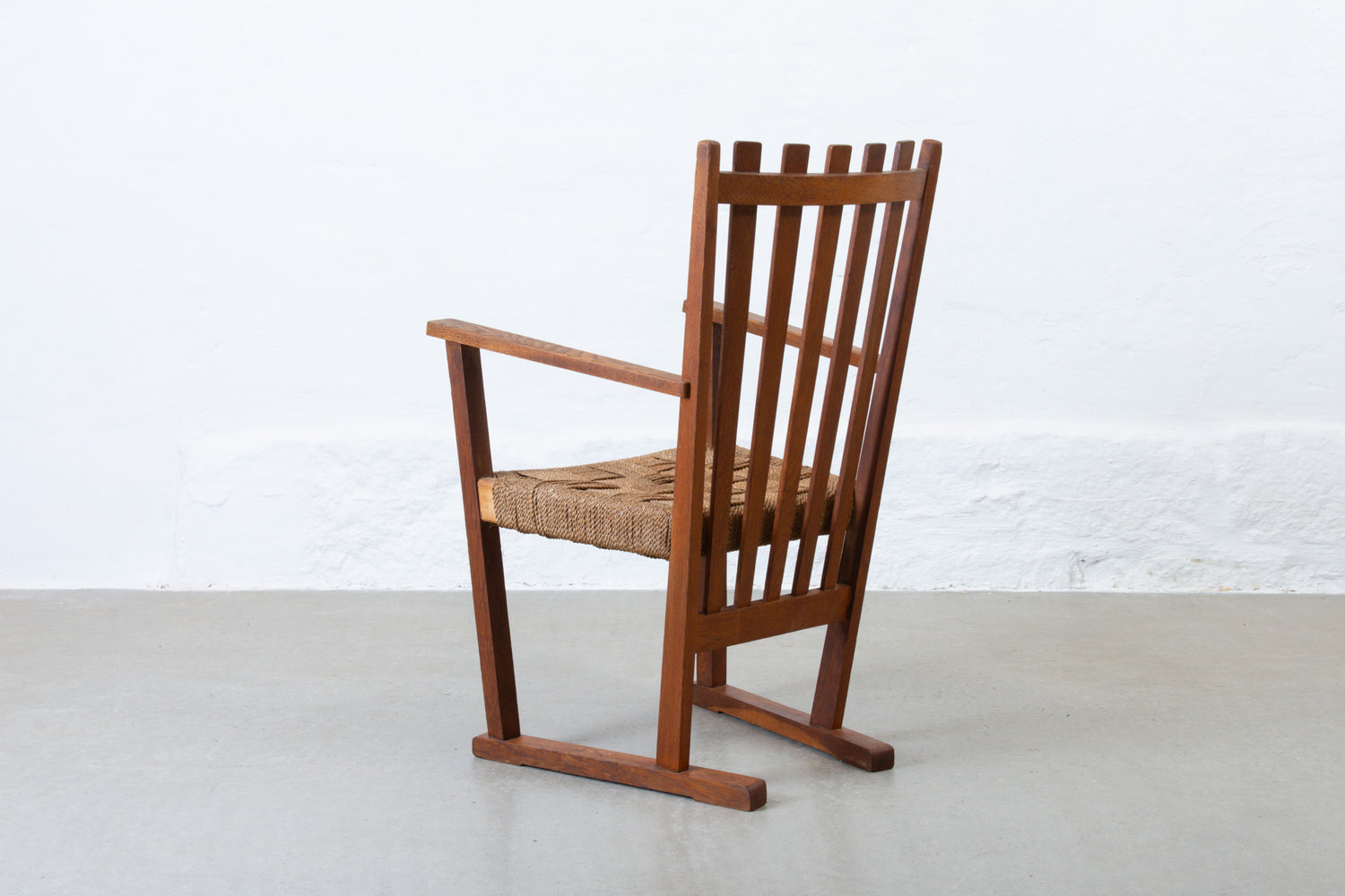 High back armchair with an oak frame, slatted backrest and woven cord seat.