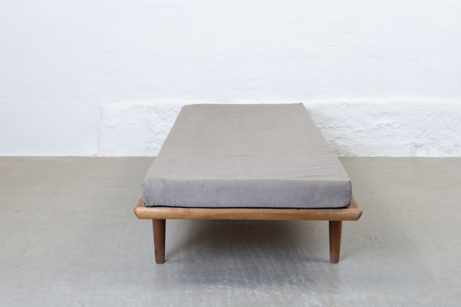 Oak-framed day bed with a foam mattress and removable backrest. Newly reupholstered in cotton corduroy.