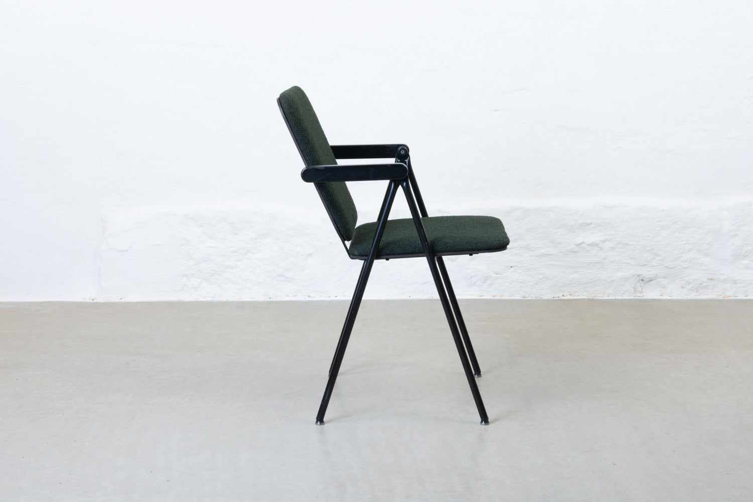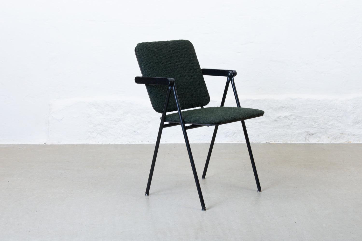 Armchair with a metal frame and padded ply seat/backrest newly reupholstered in a textured ivy green cotton/wool blend by Yarn Collective.