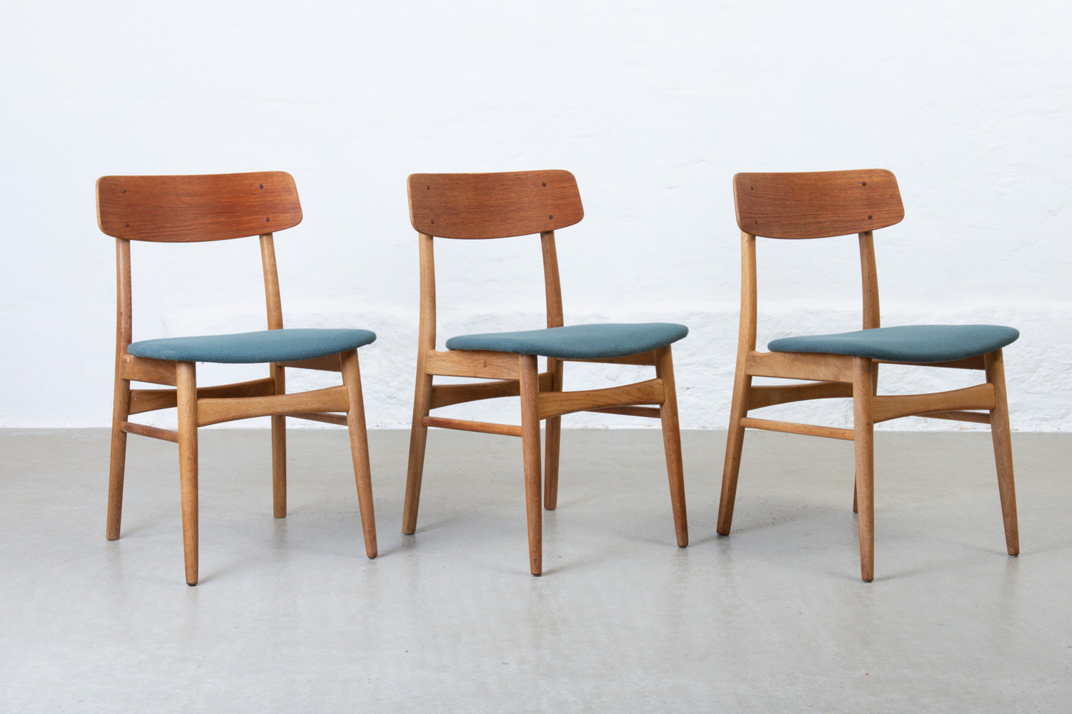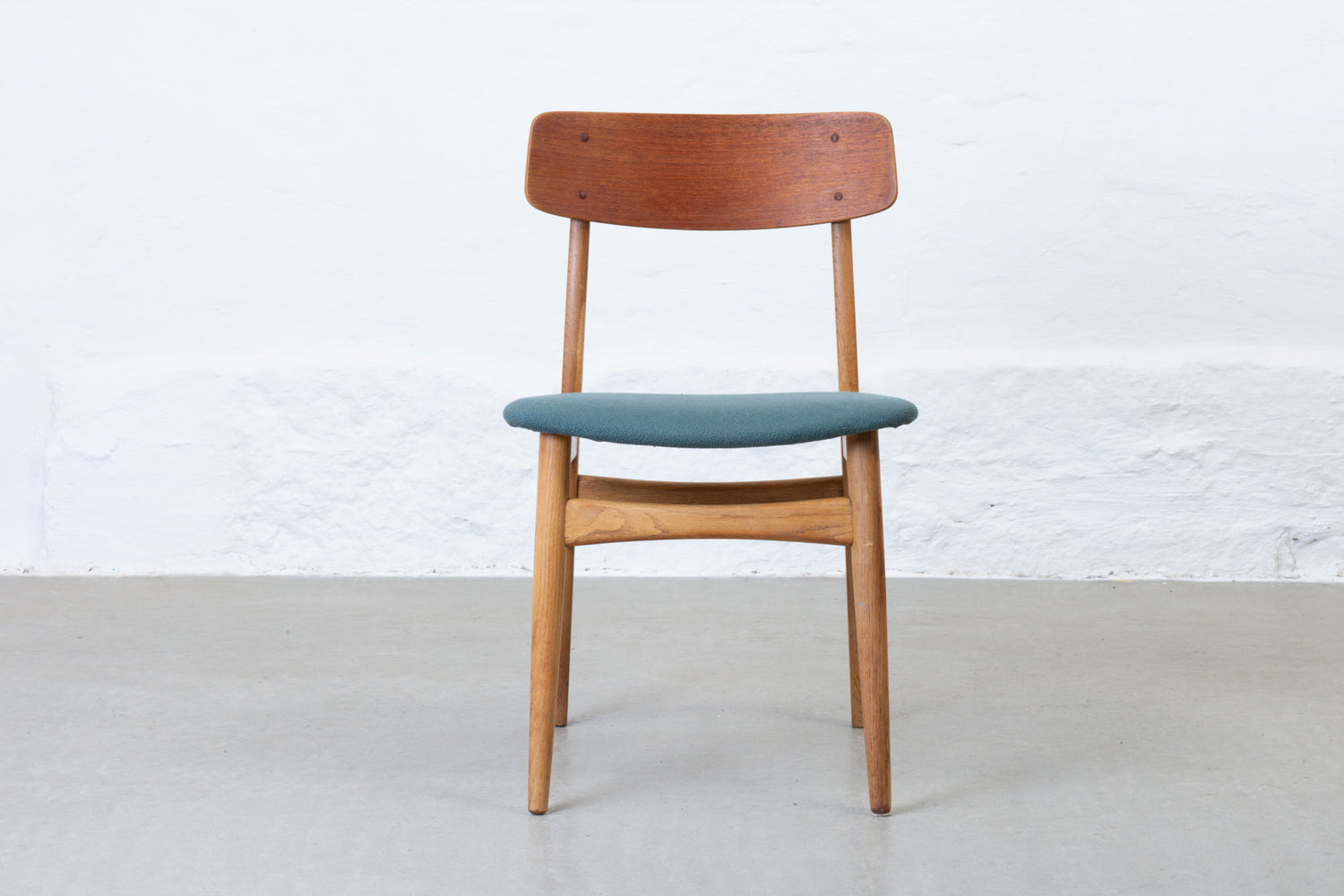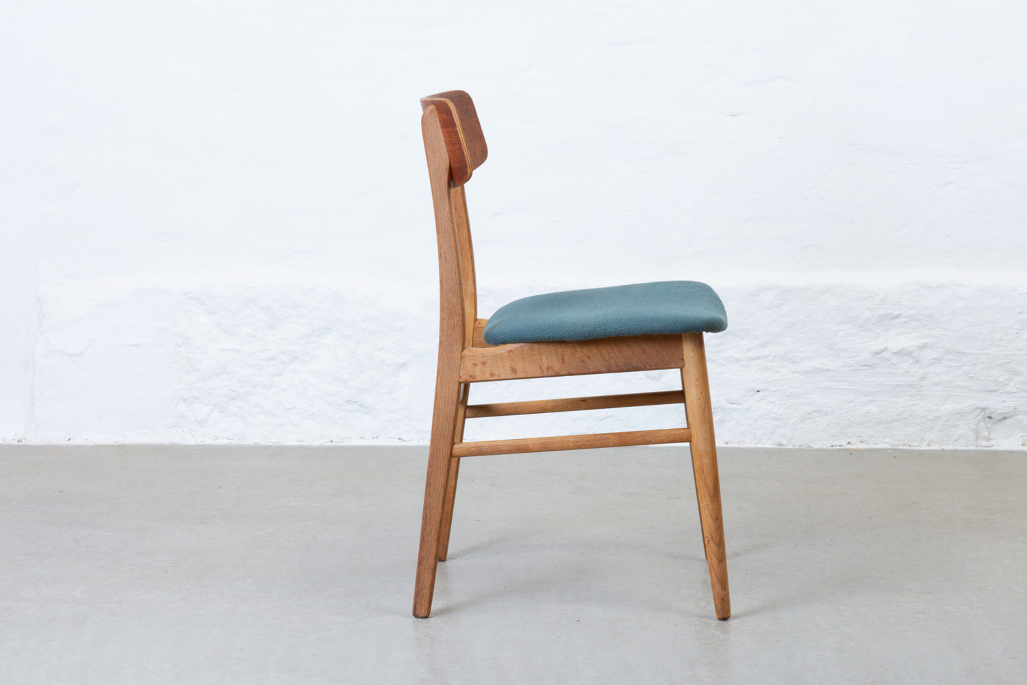 Newly reupholstered: Set of 1960s teak + oak dining chairs
