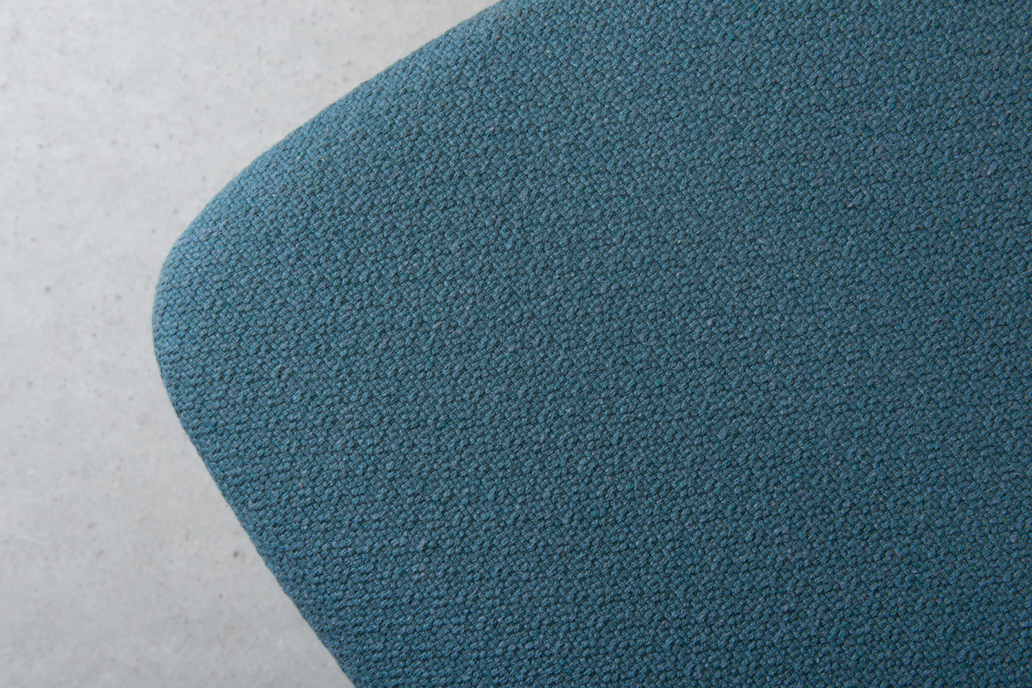 Matching set of six dining chairs with teak backs, oak frames and padded seats newly reupholstered in a recycled cotton by Yarn Collective.